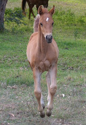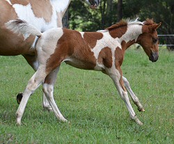 Chestnut overo filly (pearl carrier) - DOB 14.10.2021 Sire: 'Mighty Awesome' (USA/dec) (x Barlink Macho Man) Dam: 'Well Connected' (x Just Shameless (imp)) Wow! Just wow! When this filly arrived at the respectable time of 3.30 in the afternoon, I was somewhat stunned. I was now way expecting such an amazing filly. But I shouldn't have been surprised - she carries legendary bloodlines . . and it shows. She is a classy, pretty, gorgeous coloured and generally an 'awesome' filly! Sadly we lost Daisy to a paddock accident (possibly dog attack), in 2023. |