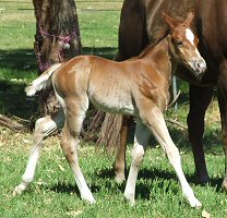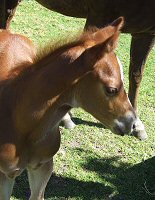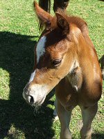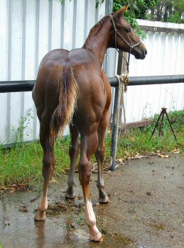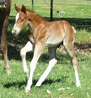 Even though again we were disappointed not to get colour, that soon gave way to being thoroughly entranced by this foal - he is pretty, has natural muscle, is soft moving and has the most engaging personality ... and all wrapped up in one little bundle of energy! And again this foal demonstrates the power of pedigree which he has in bucket loads. Top line: Barlink Macho Man, Sonny Dee Bar, Impressive and Leo Bottom line: Just Shameless, Sonny Dee Bar, Impressive, Driftauck Pierre and Magnolia Pay. His paddock name is 'Mighty Mouse' or 'Mouse' for short as we reckoned he looks like the cartoon character with his muscles bulging all over the place! 'Mouse was purchased by Rudi Simic from Putty and has become everyone's favourite. Words from his trainer: "Mouse is looking very fat and shiny. Rudi is very happy with him. I like him being here as well, anyone can hop on him. He takes my young horses out and helps tease my girls so I knew when to AI them. And he looks cute." |