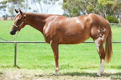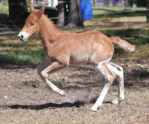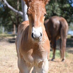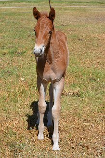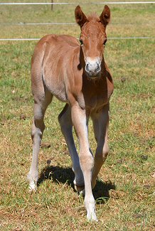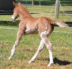 What a surprise this little bundle was - when she was first born we thought she was solid chestnut like her mum. Then she stood up and revealed that she was painted on the other side - but not like her dad. She is different to both mum and dad, so it was a litte bit of a shock. But she was soon showing the sweet disposition of her mum and her brothers and sister. Her colour test results came back negative for all white genes. She's one of a kind! |
